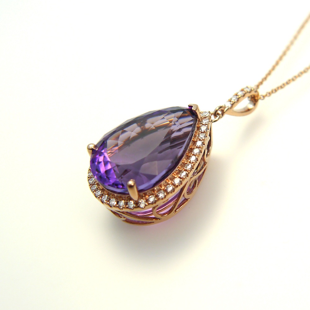 A stunning and large pear shaped, faceted Amethyst gemstone estimated at about 20 carats steals the show in this lovely pendant. Set in a romantic 14k Rose Gold setting and accented by a halo of small diamonds.