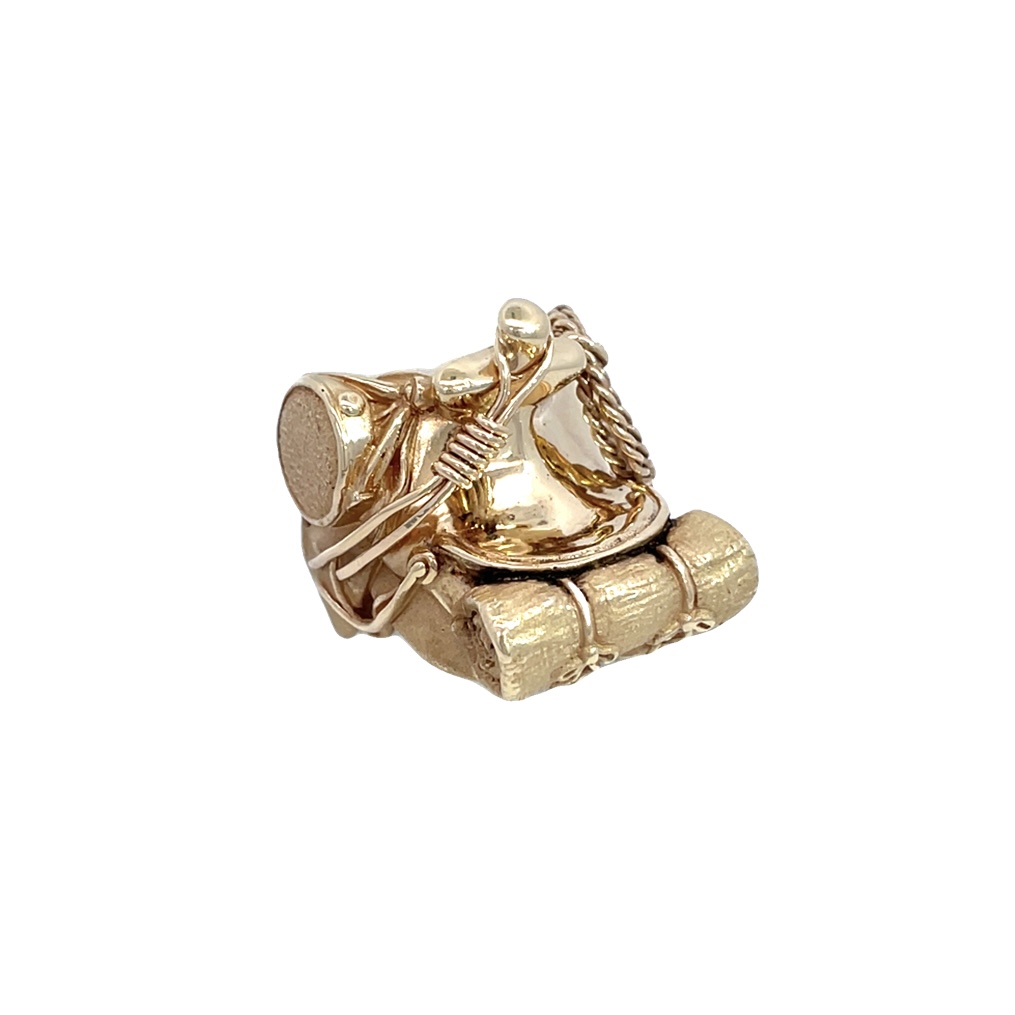 This stunning 14k yellow gold ring showcases intricate craftsmanship, featuring a unique design that combines elegance with a touch of modern flair in a unique saddle. Paired with a rope, saddle bag, and blanket this saddle ring truly is one of a kind! Perfect for any occasion, it adds a sophisticated touch to your jewelry collection. 40 grams of gold, size  10.5 & stamped 14k.