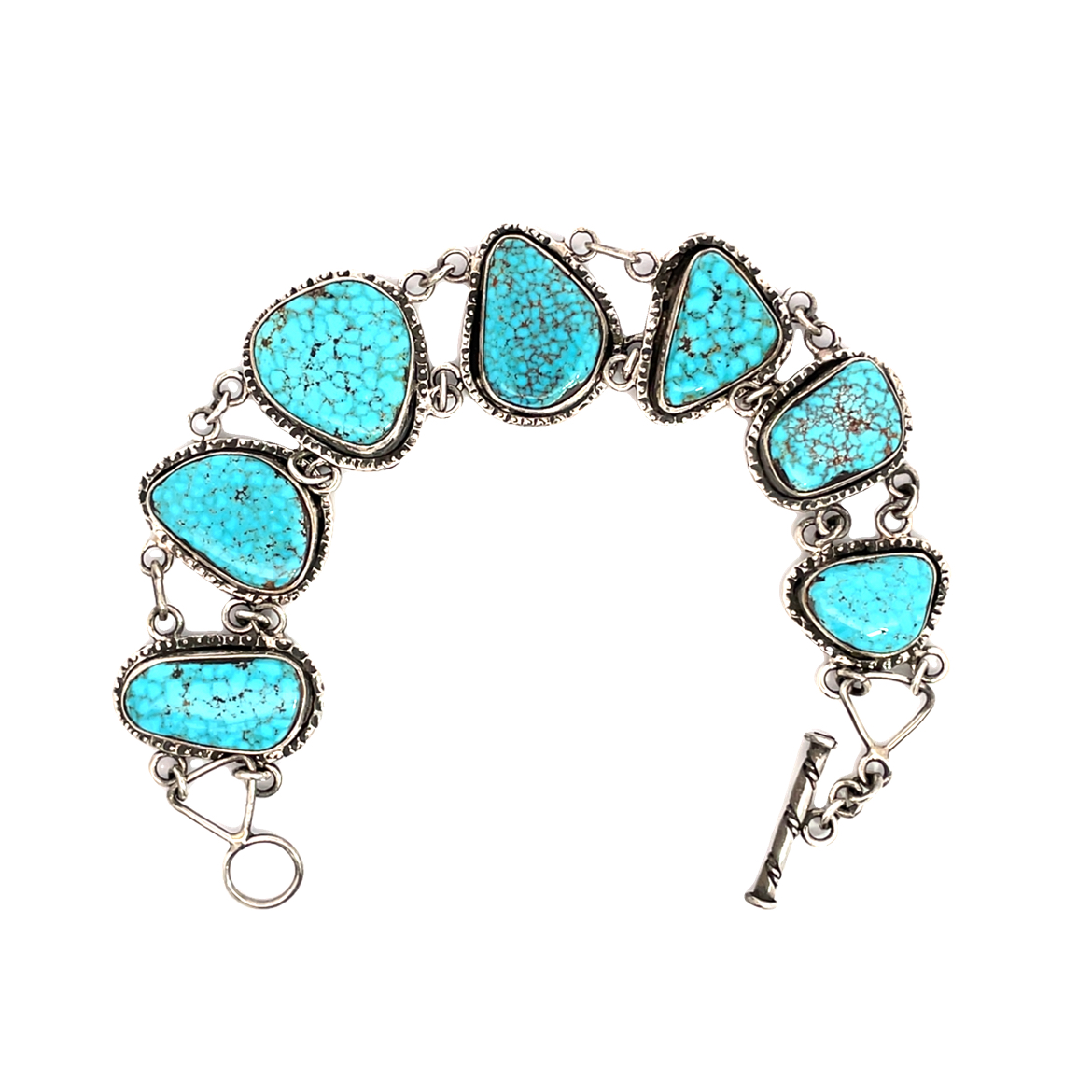 Handcrafted right here at our Tempe shop! An exquisite turquoise bracelet features a series of beautifully shaped stones, each showcasing a unique pattern and vibrant color. The intricate silver detailing enhances the natural beauty of the turquoise, making it a standout piece for any jewelry collection. Secured with a toggle clasp. Stamped with jeweler’s custom stamp “Arteaga”, “Jewelsmith” & “ster” on the back.