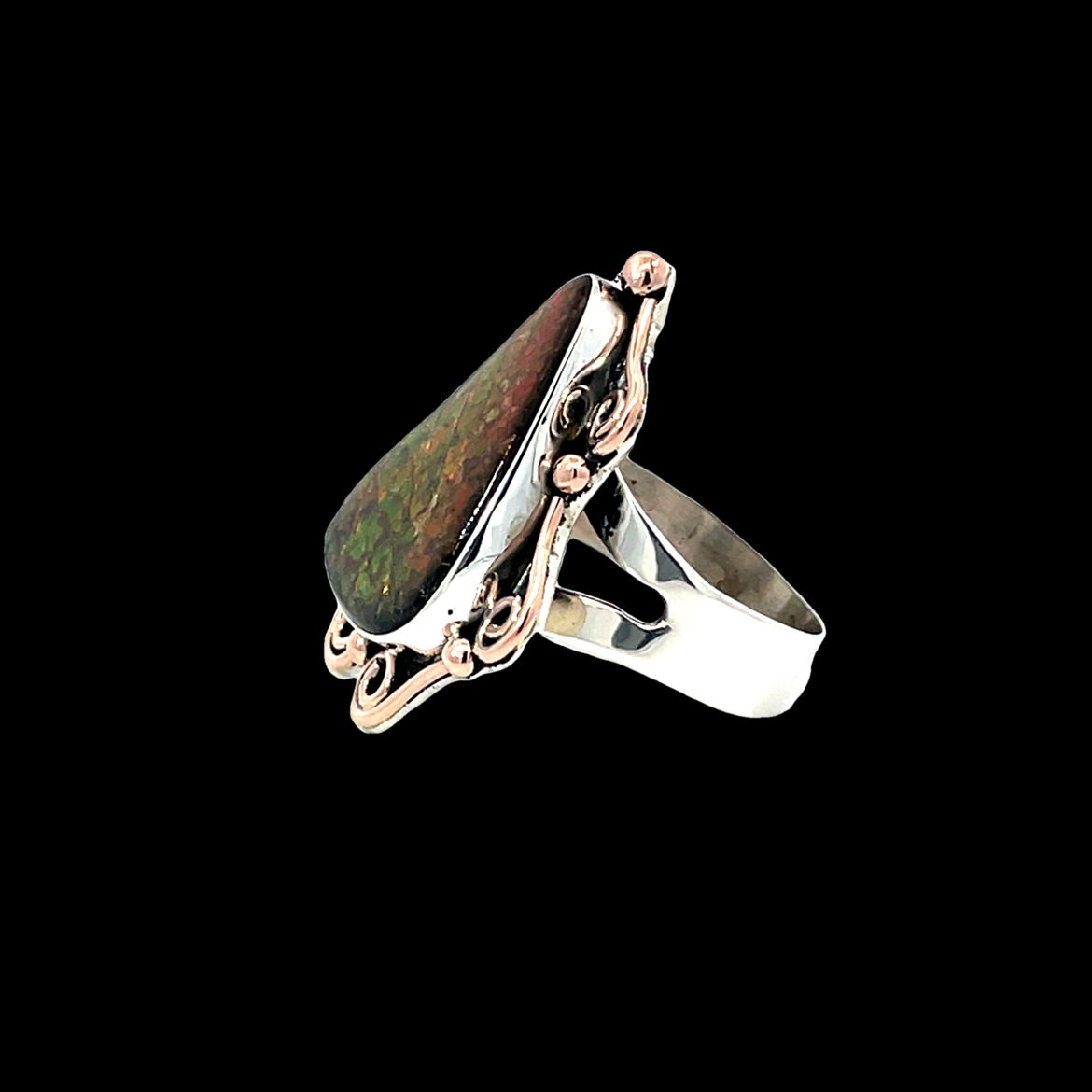 This exquisite ring features a striking red and green Ammonites shell stone, beautifully set in intricate silver filigree with rose gold detailing. The unique design captures the eye, making it a perfect statement piece for any occasion. Elevate your jewelry collection with this one-of-a-kind ring that showcases both elegance and artistry. Size 9.75
