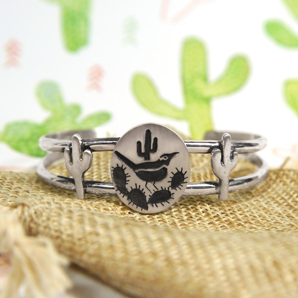 Designed and hand cut out of sterling silver right here in out Tempe, AZ jewelry shop. This Arizona Desert themed bracelet depicts several cacti and a desert bird on a decorative oval plate of pure sterling silver.