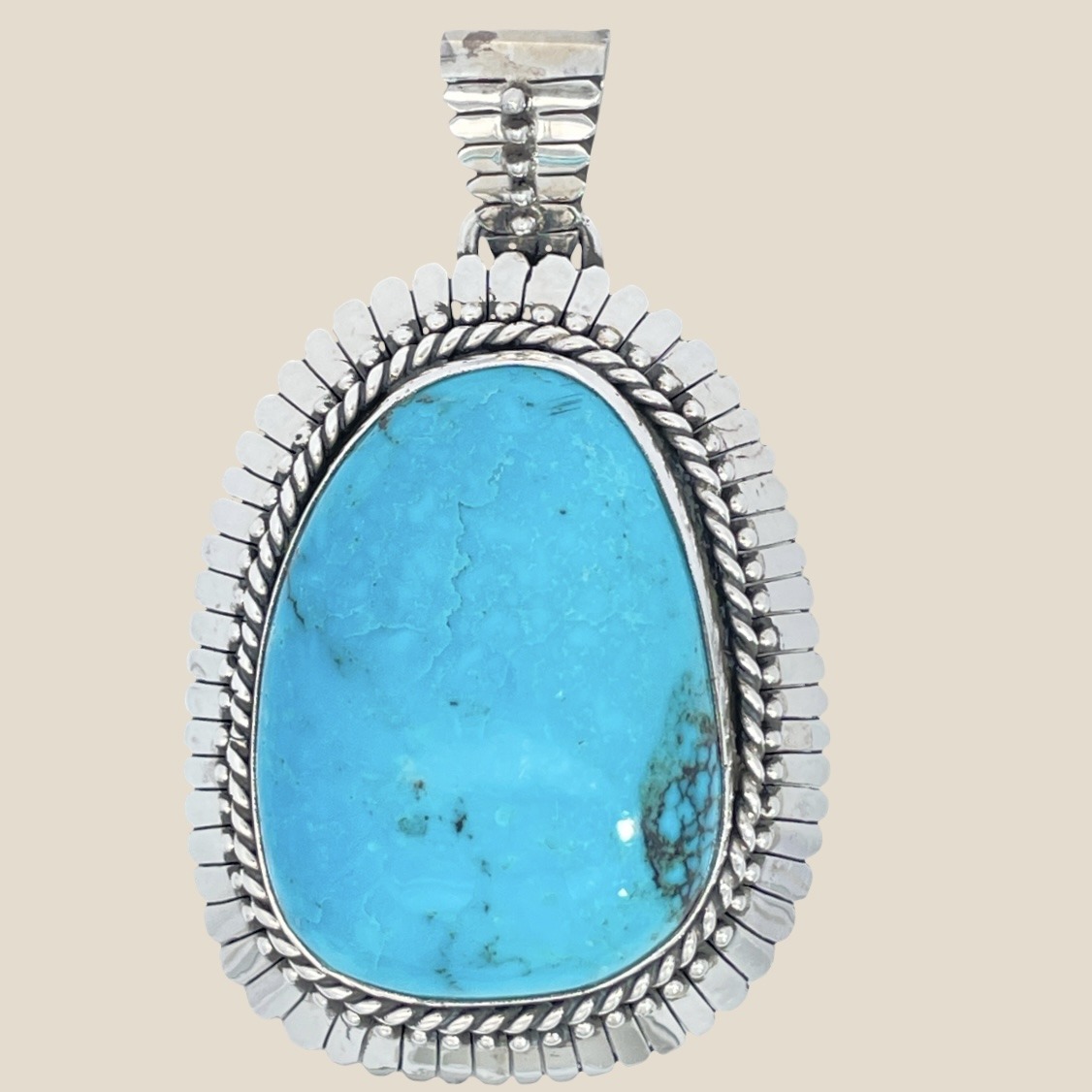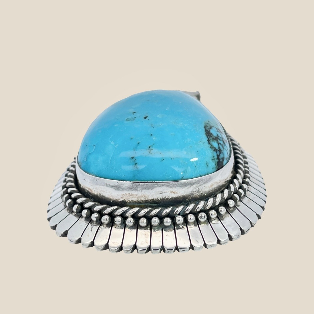 Elevate your style with this unique silver pendant featuring a striking cabochon cut turquoise gemstone. The gorgeous blue turquoise is expertly set in a handcrafted sterling silver design, making this pendant a standout addition to any jewelry collection. A perfect blend of elegance and natural beauty.3 inches long and 2 inches wide