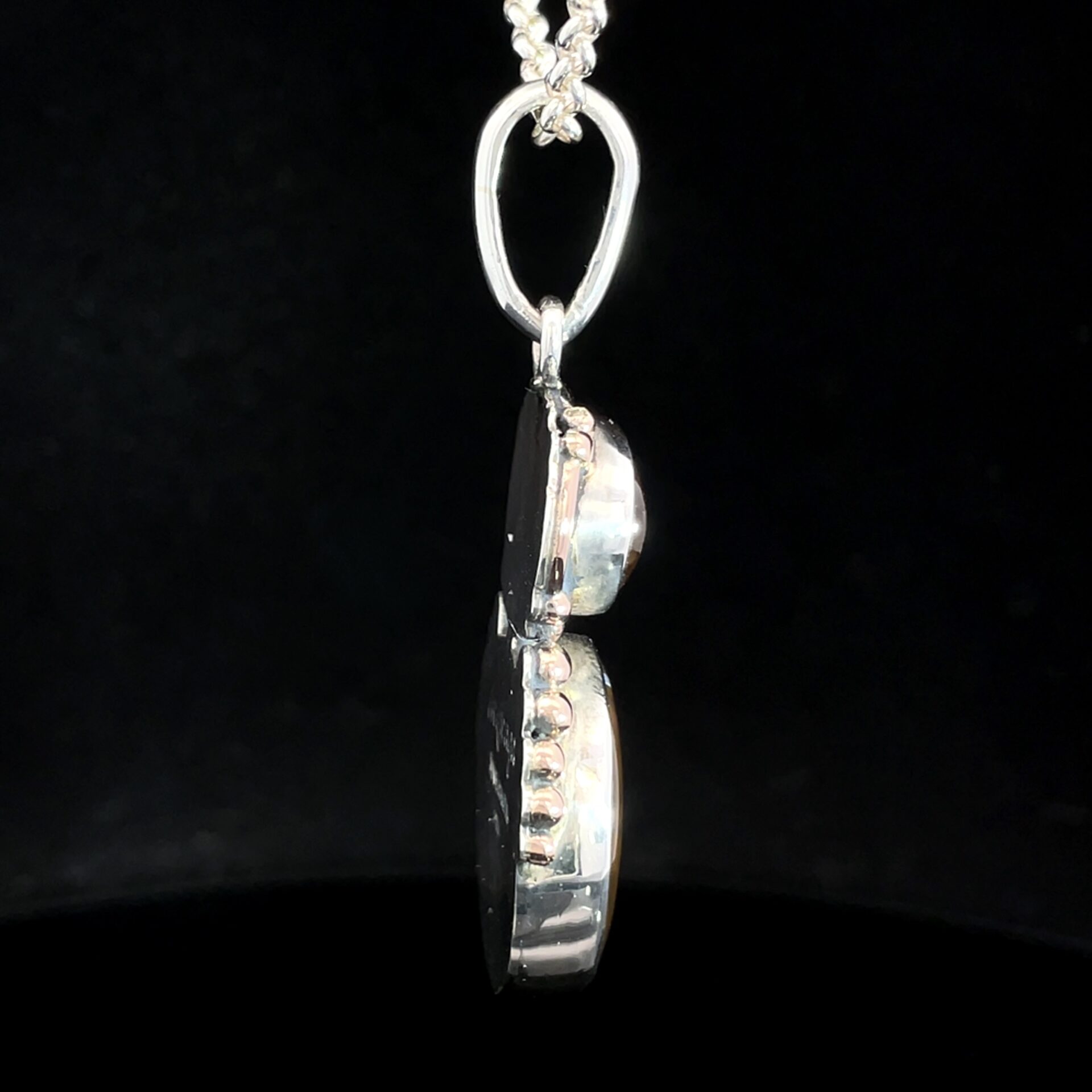 A uniquely stunning two-tone fire agate pendant features a unique design that combines shimmering sterling silver with a captivating gemstone. The intricate detailing of 14k rose gold and vibrant colors make it a perfect accessory for any occasion, adding a touch of elegance to your outfit. Doesn’t come with chain. Hangs around 2 inches and around 1 inch wide