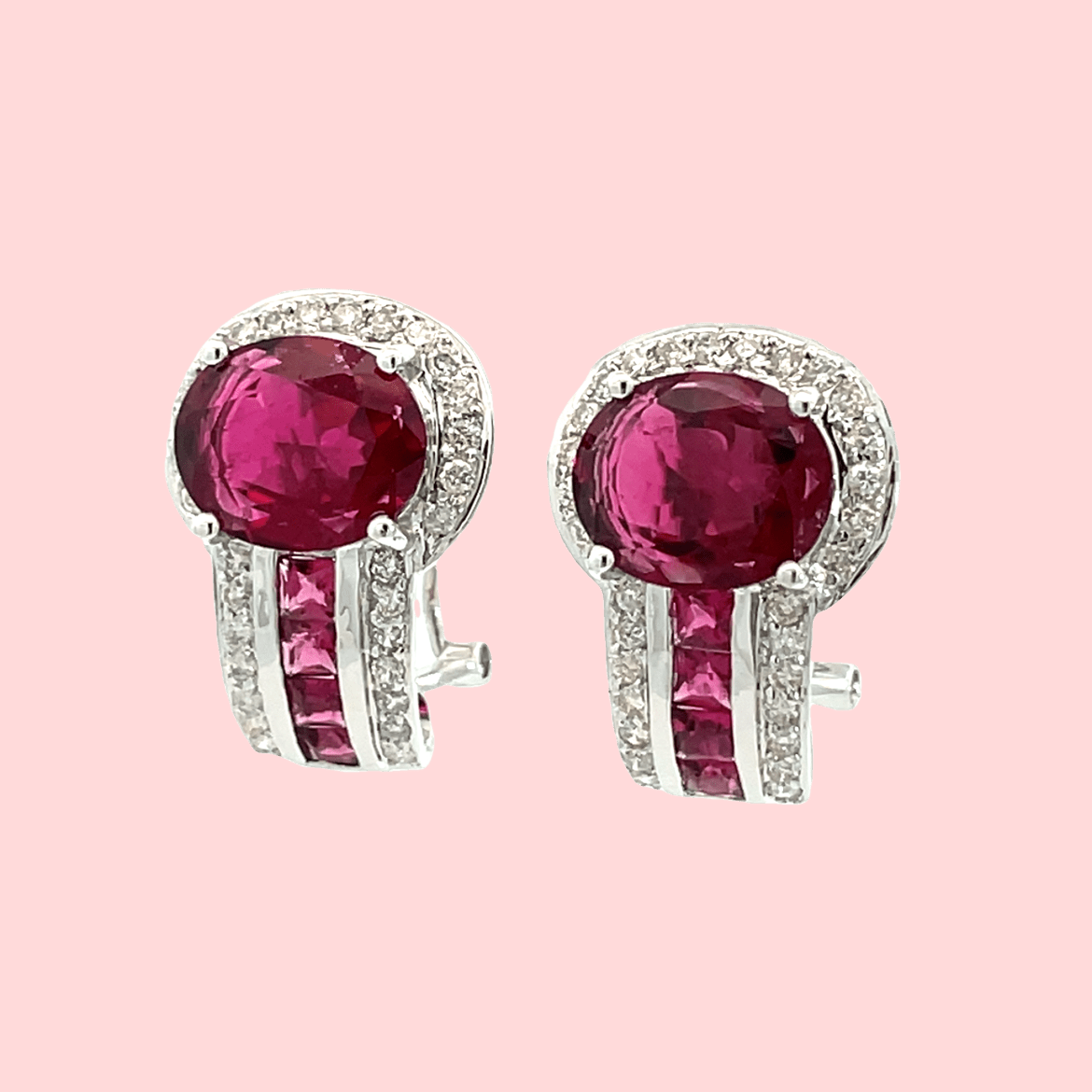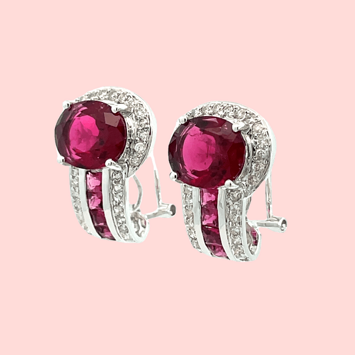 These beautiful earrings feature stunning oval-cut rubellite surrounded by a halo of sparkling diamonds and square-cut rubellites. The vibrant pink gemstones are elegantly set in a sleek design, making them perfect for adding a touch of luxury to any outfit. Ideal for special occasions, these earrings are a timeless addition to any jewelry collection.